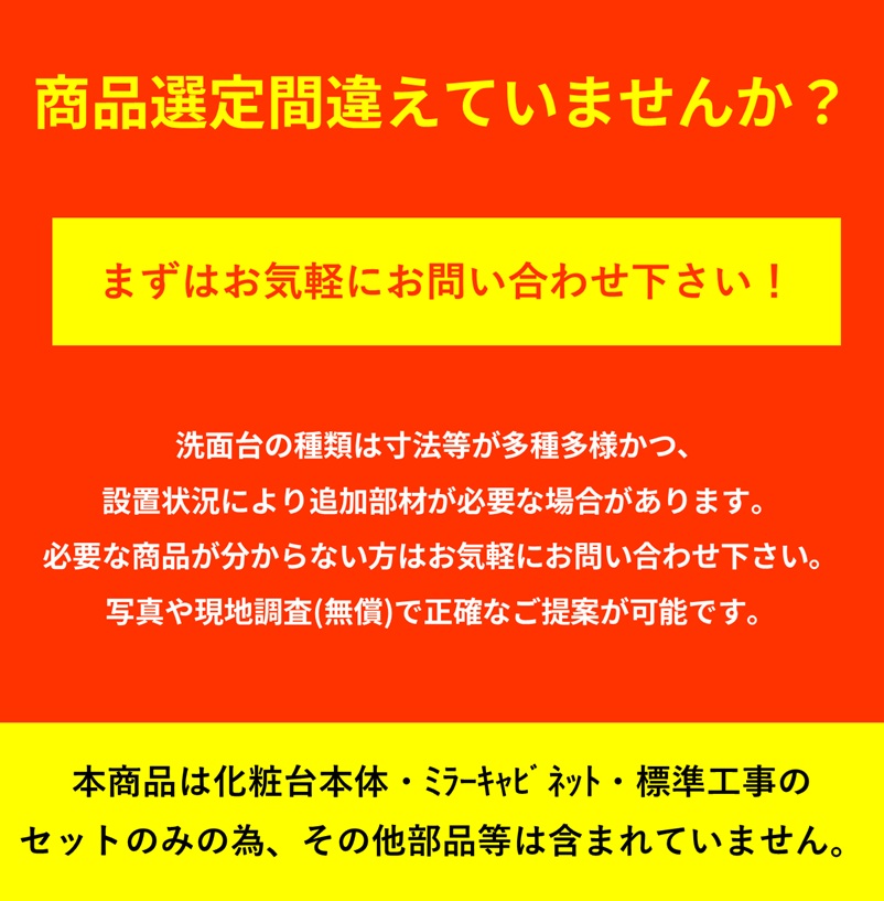 ※商品は洗面化粧台とミラーキャビネット本体のみの為、その他部材が必要な場合は別途費用となります。