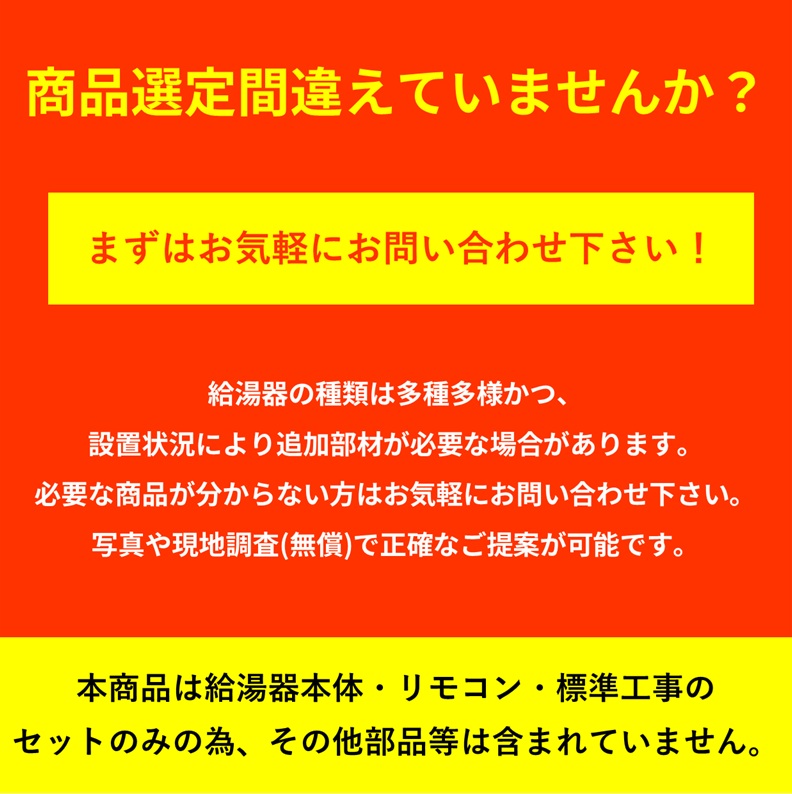 ※商品は給湯器本体とメインリモコンのみの為、その他部材が必要な場合は別途費用となります。